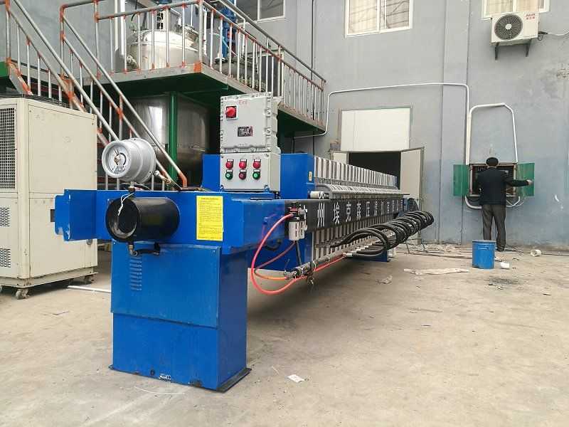 隔膜壓榨壓濾機(jī)是由隔膜板和廂式濾板排列組成濾室,在輸料泵的壓力作用下將料漿輸入濾室,通過過濾介質(zhì)(濾布)將料漿中的固體和液體分離,當(dāng)料漿中的固體形成餅后,再向隔膜通入空氣,對(duì)濾室內(nèi)的固體充分壓榨。